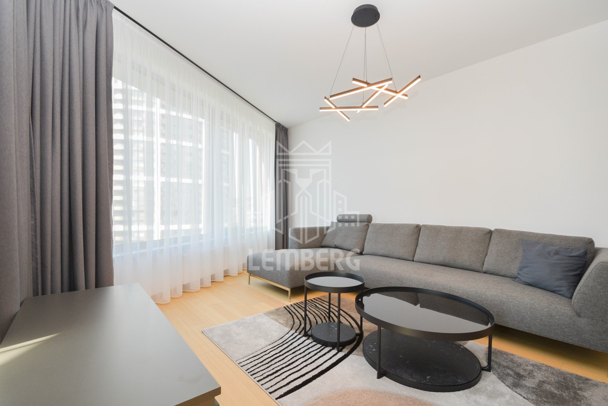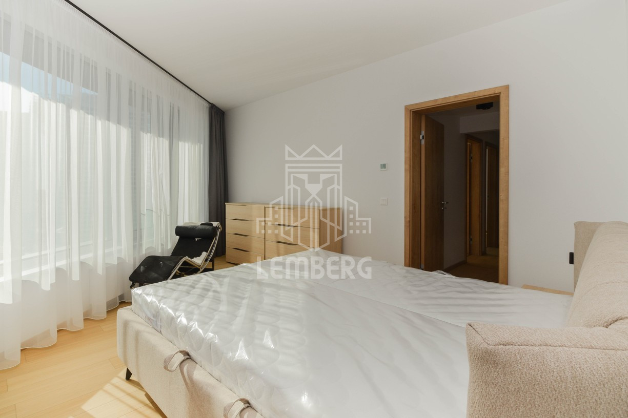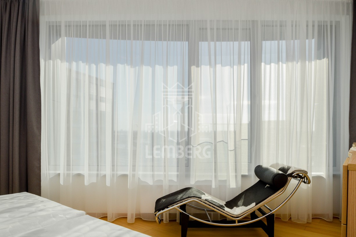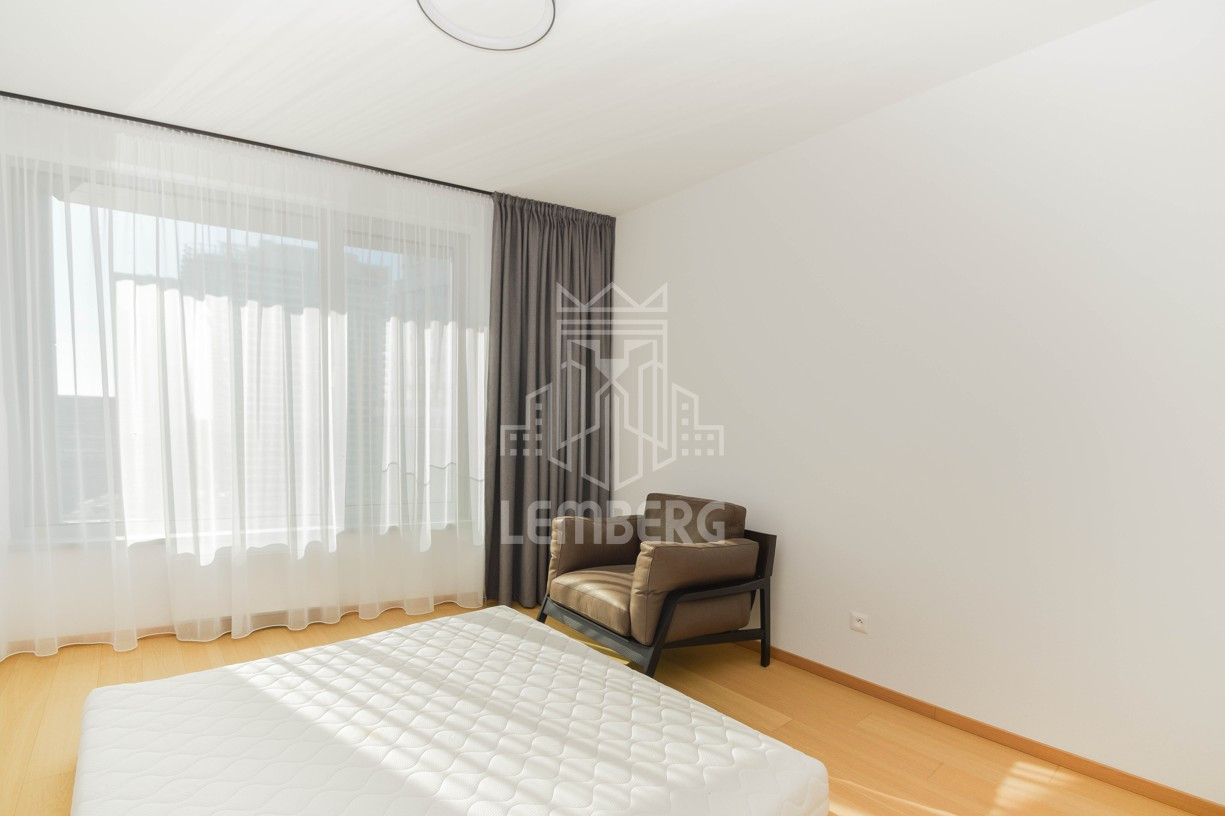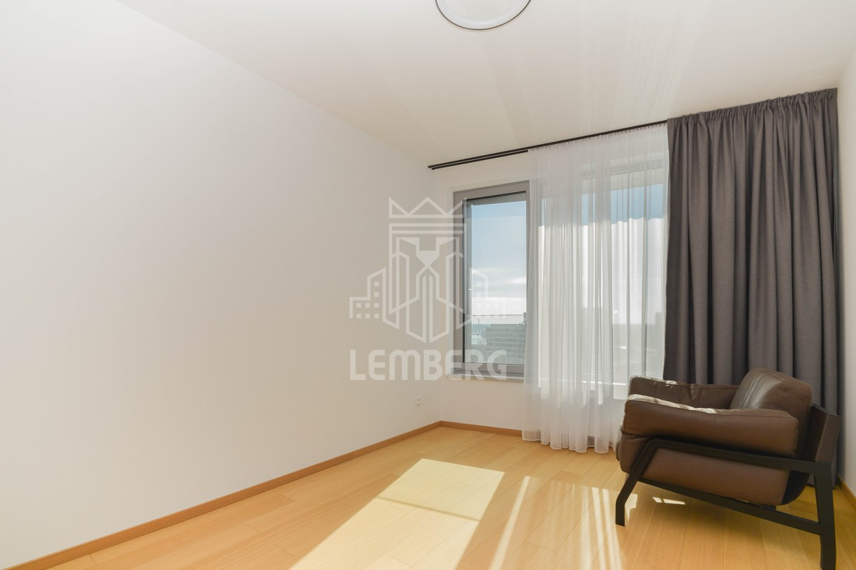 Современная 4-комнатная квартира площадью 112 м2 с лоджией 1,75 м2 расположена в эксклюзивном жилом проекте Sky Park 4.veža. Башня является частью многофункционального проекта, спроектированного всемирно известным архитектором Zaha Hadid. Жители имеют доступ к смотровой террасе на 30-м этаже с панорамным видом на весь город.
