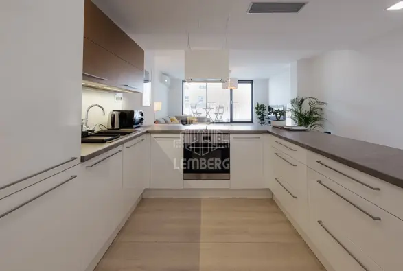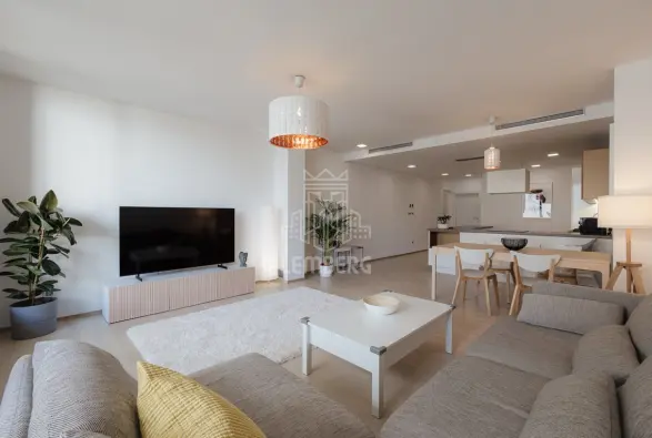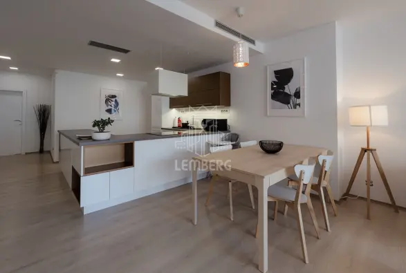 Квартира сдается полностью меблированной и оборудованной встроенной кухонной техникой, такой как электрическая варочная панель, электрическая духовка, посудомоечная машина, микроволновая печь, холодильник с морозильной камерой, вытяжка и электрочайник. Кроме того, в квартире находятся стиральная машина, телевизор и кондиционер (гостиная и главная спальня). Квартира предлагает множество мест для хранения во встроенных шкафах, которые находятся в комнатах и в прихожей.