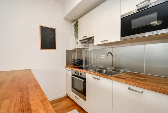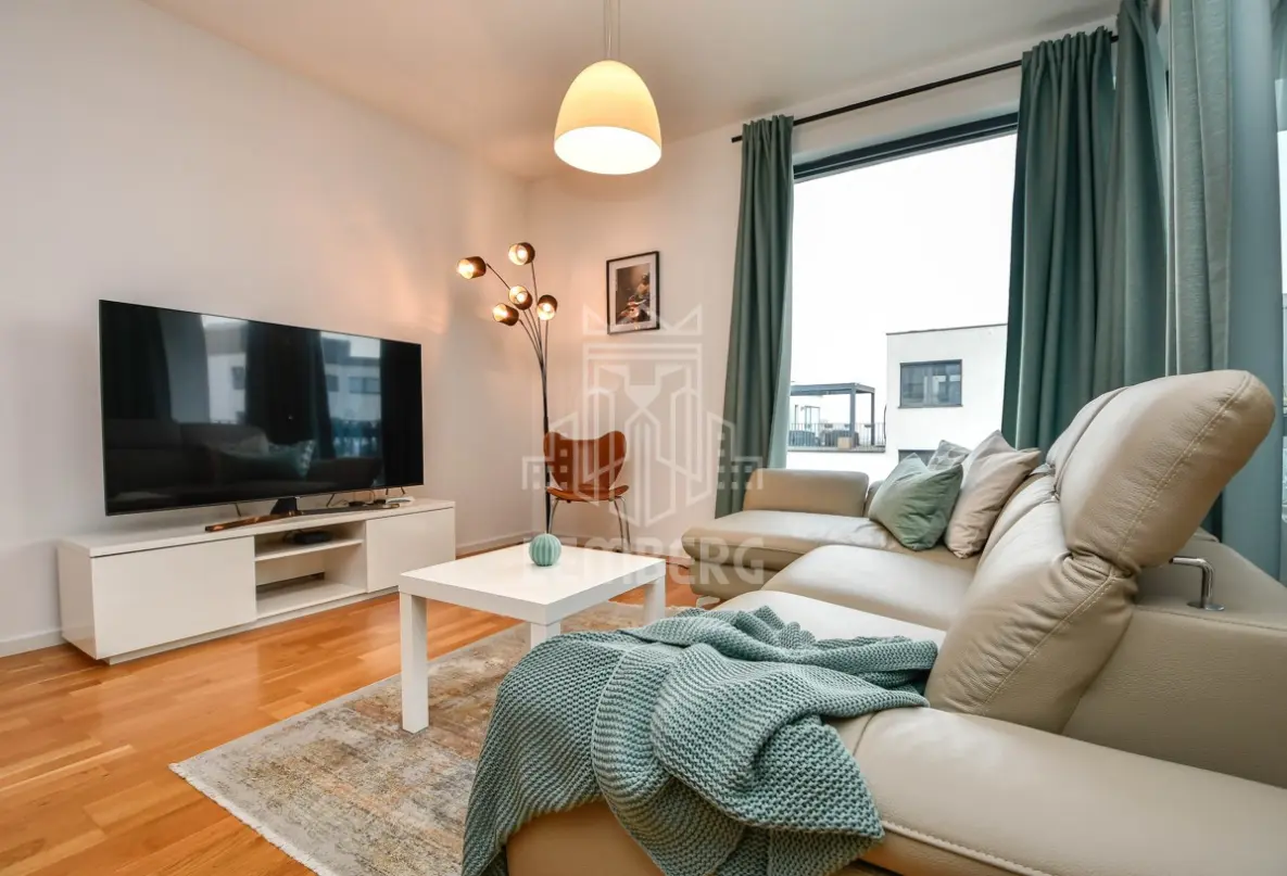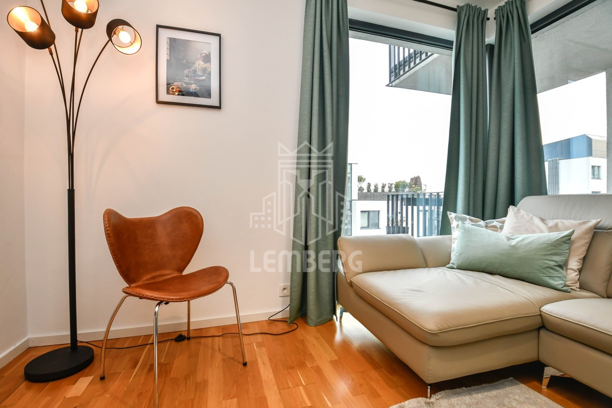 Квартира здається повністю мебльованою та обладнаною електроприладами, такими як пральна машина, кондиціонер та вбудована кухонна техніка: індукційна варильна панель, холодильник з морозильною камерою, електрична духовка, витяжка, мікрохвильова піч та посудомийна машина.