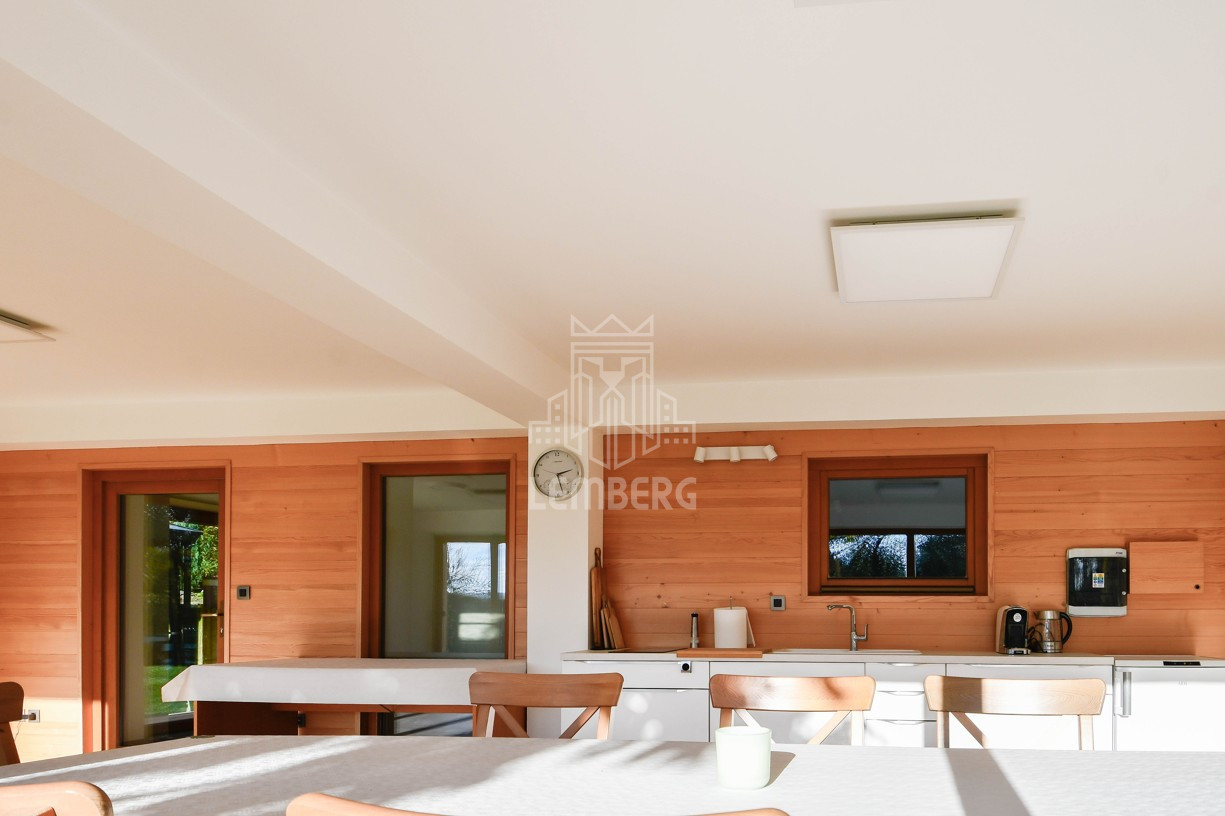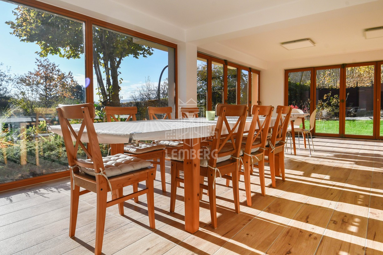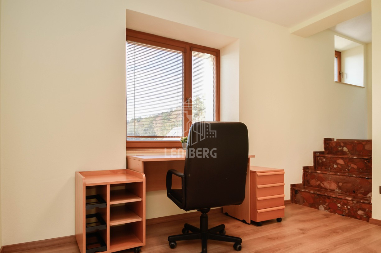 * Перший поверх (Призем'я): відкрита вітальня з каміном, кухня з їдальнею та окрема кімната (ідеально під кабінет). З вітальні завдяки великим вікнам є вихід на терасу (11 м2) з унікальним краєвидом на околиці та сад.