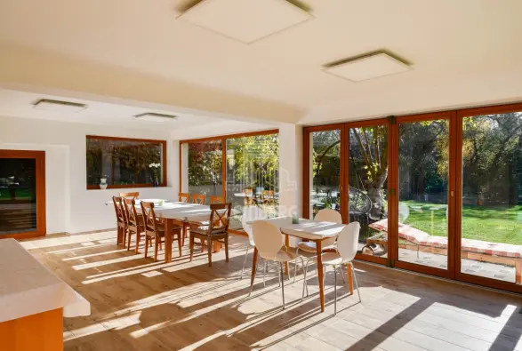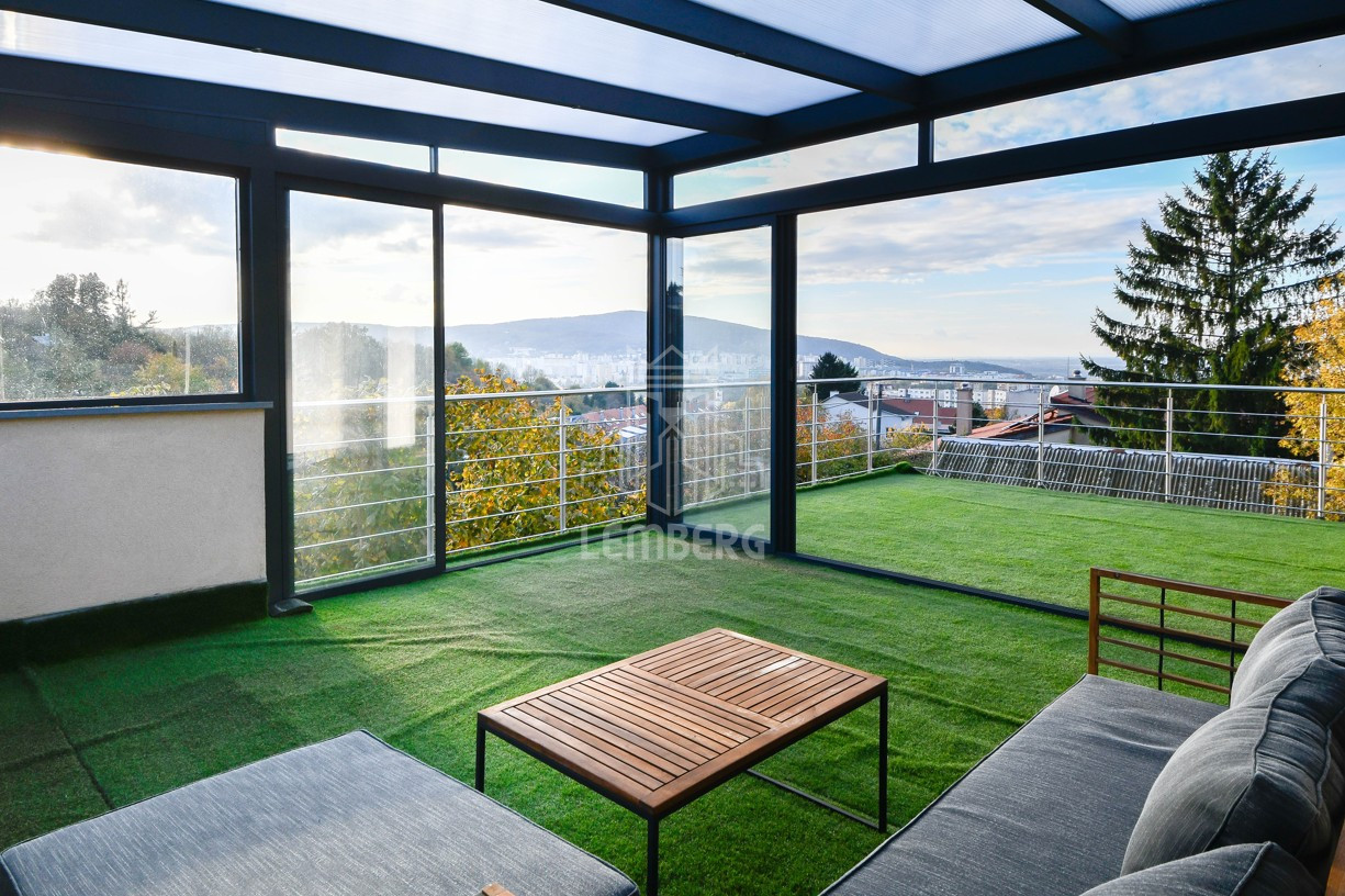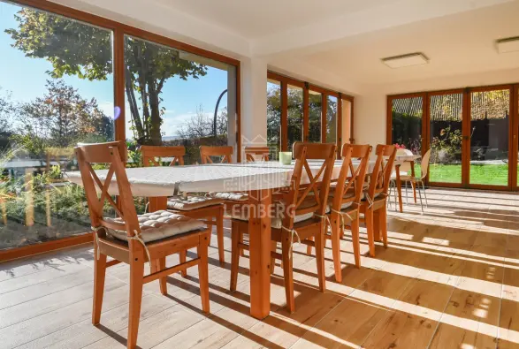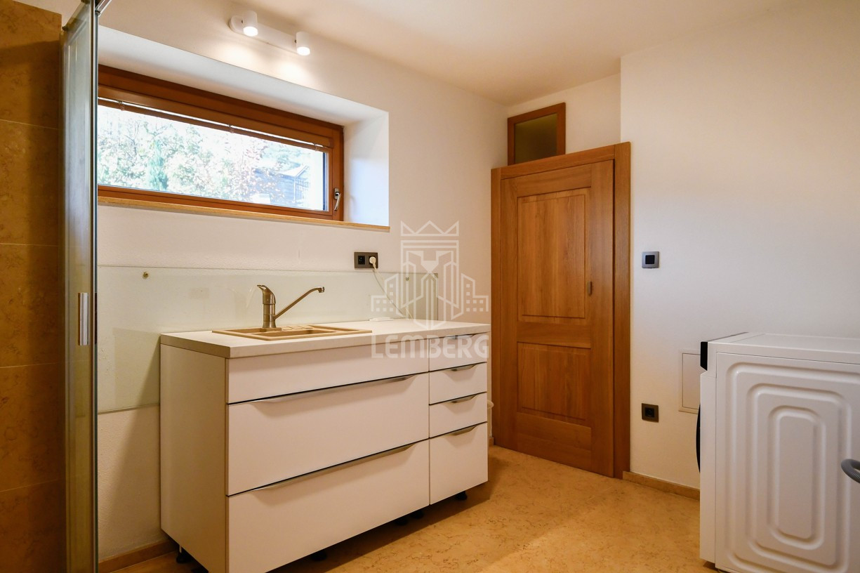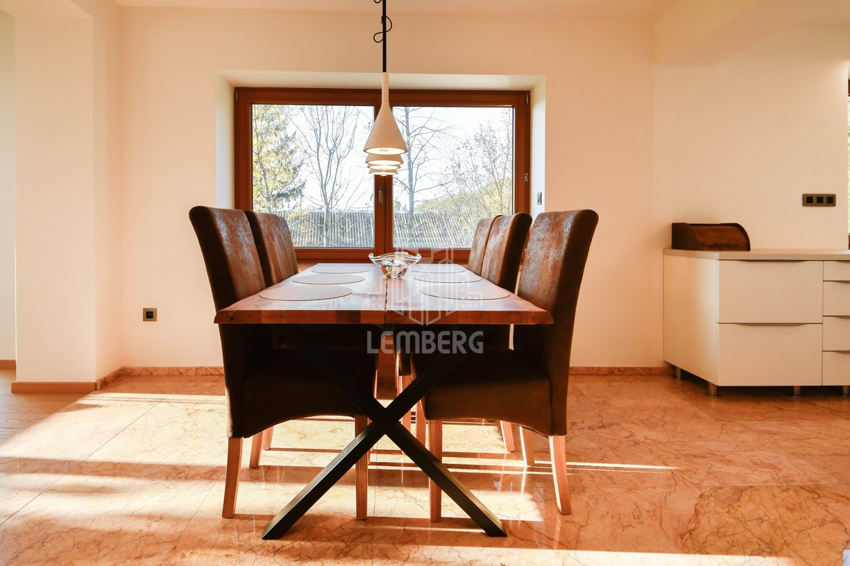 * Перший поверх (Призем'я): відкрита вітальня з каміном, кухня з їдальнею та окрема кімната (ідеально під кабінет). З вітальні завдяки великим вікнам є вихід на терасу (11 м2) з унікальним краєвидом на околиці та сад.